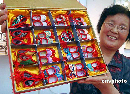 5月24日,苏州民间艺人展示“迷你”绣花鞋。近日,由苏州民间艺人精心制作的一双双仅拇指大小的绣花鞋,因其迷你可爱的形状而受到顾客的青睐。