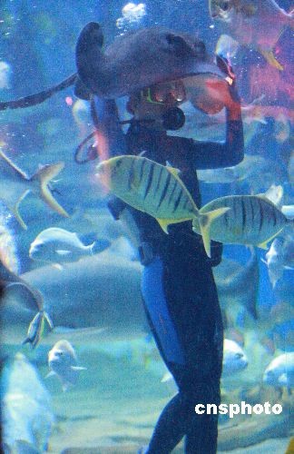 六一期间,哈尔滨极地馆的两尾鳐鱼将隆重上演“水中华尔兹”。表演是由一位驯养师和两尾鳐鱼在水下共同完成的,时长20分钟。此项表演使哈尔滨极地馆成为全国首家有鳐鱼表演的极地馆。参加表演的两尾鳐鱼虽都处于软骨鱼类的青春期,但是它们的智商却比动物类里的兔子和鸽子高,学习能力极强。因为鳐鱼的尾部长有毒尾刺,对人有攻击性,所以表演将在高度的危险中进行。中新社发 姚庭山 摄