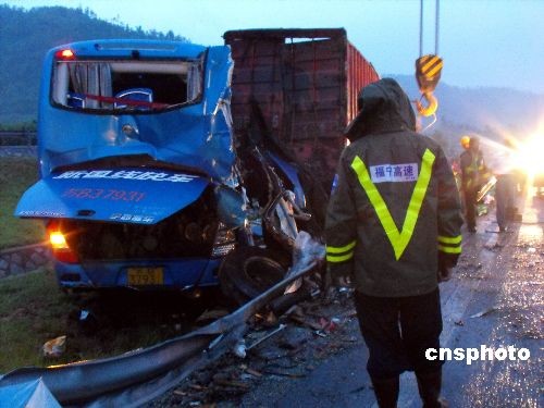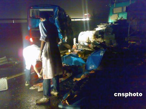 5月23日22时10分,沈海高速公路福鼎秦屿路段多车发生相撞,其中一辆载有37人由泉州开往无锡的卧铺客车与一辆大挂车相撞后,撞进了高速路面中间隔离带,车上5名乘客当场身亡,其余乘客不同程度受伤。截至目前,福鼎市医院共抢救事故伤员32名,共有6名伤者接受入院治疗,院方正竭尽全力抢救。事故原因还在进一步调查中。中新社发 陈翊群 摄