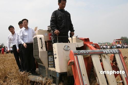 5月26日,河南驻马店,河南省长郭庚茂登上收割机与农机手一起收麦子。当日,小麦产量占全国四分之一的“中国粮仓”河南省启动2009全国小麦跨区机械收割“第一镰”。中新社发 王中举 摄