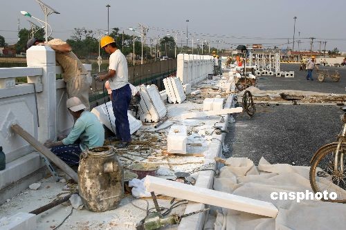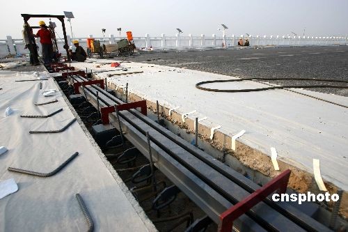 5月26日,卢沟新桥桥面沥青摊铺完成,预计6月初该桥将正式通车。贯通后的卢沟新桥将有效缓解北京西南五环和门头沟地区的进出京交通压力。据北京市交通委路政局介绍,卢沟新桥拆旧建新工程自2008年底启动,预计今年6月初左右完工。根据设计,卢沟新桥总长560米,总宽21米,双向四车道,两侧人行道各宽2.5米。 中新社发 富田 摄