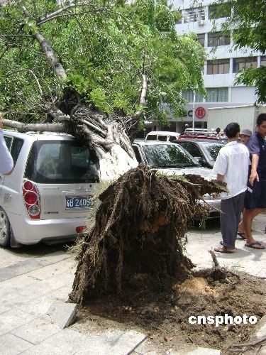 5月26日,海南省三亚市解放一路,一颗10多米高的大榕树突然倒塌,压在停放在路边的小轿车上,车顶被倒塌的大榕树压陷些许。三亚园林局工作人员介绍说,三亚园林局将会专门研究解决街边大树突然倒塌这一问题。中新社发 尹海明 摄