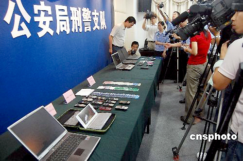 5月27日上午,广州市公安局向媒体通报,在今年上半年进行的打击电话诈骗犯罪专项行动中,打掉电话诈骗团伙十一个,破获电话诈骗案件七十四宗,缴获一批涉案银行卡、手机等。 中新社发 柯小军 摄