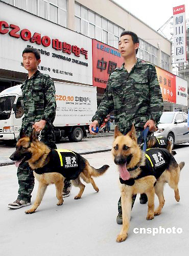 近日,浙江温州市乐清公安局首次将警犬投入到社会治安管理中。首批4条警犬分为两组:一组负责乐清柳市车站周边的巡逻,另一组配合警方设卡和对可疑人员的追踪、围堵。2009年4月份,乐清警方专门成立了警犬基地,由保安公司负责饲养与日常管理。目前,警犬基地已从南京军区购买20只警犬,每只身价都在万元以上,多为体型强壮匀称、勇敢无畏的德国牧羊犬。据介绍,这20只护卫犬主要用于温州乐清的警戒、巡逻等,其中4只首批受训成功投入使用。中新社发 许勋磊 摄