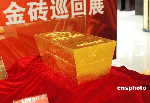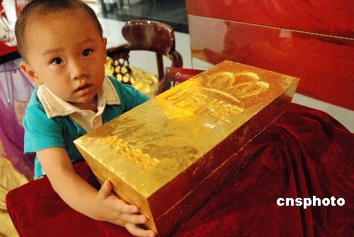 6月10日,一块108公斤重的稀世金条亮相山东滨州黄金大厦,吸引了许多市民的眼球。据了解,这块千足金条价值2160万元。中新社发 张滨 摄