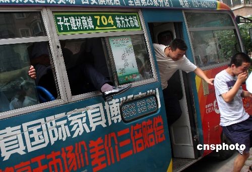 2009年6月16日,在西安明德门,西安市公安局交警支队雁塔大队与一家汽车客运公司一起,联合举行了一场公交突发事件逃生演习,通过模拟演练,对司乘人员进行安全防范教育,提高司乘人员对紧急事件的应急处理能力。中新社发 梁萌 摄