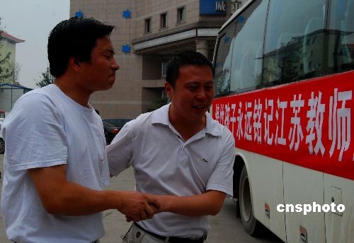 6月16日中午,绵竹地震灾区最后一批52名江苏帮扶支教老师圆满完成为期131天的支教任务,离开绵竹踏上归途。绵竹社会各界群众和学生组成的军乐队前来为他们送行。据悉,地震后,江苏省先后派遣了110名中小学骨干教师前往绵竹灾区各中小学担负支教任务。中新社发 胥辉 摄