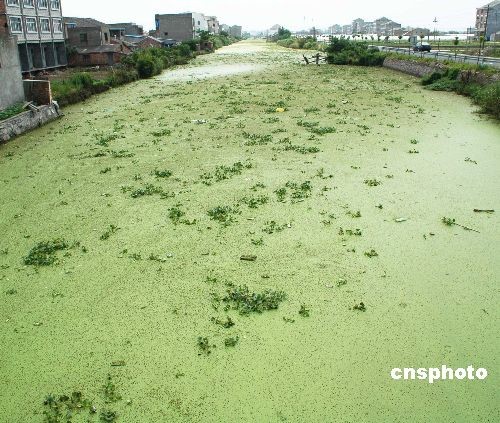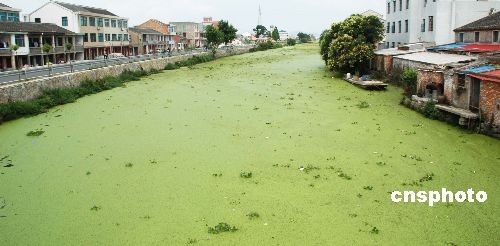 6月16日,在浙江省温岭市滨海镇永胜村,绿色的浮萍铺满河面,像一条厚厚的绿毯子将河道盖得严严实实,让河流无法“呼吸”。中新社发 江勇兵 摄