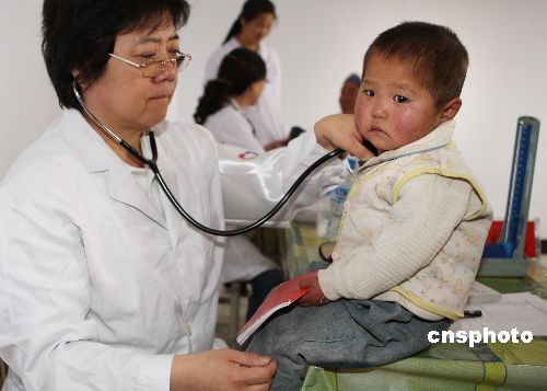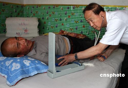 参加“共铸中国心”——西部地区心脑血管健康关爱工程的150名北京心脑血管医学专家,6月19日开始在宁夏回族自治区六盘山脚下的固原市农村乡镇为贫困农民诊病治疗。固原是中国最贫困的地区之一,也是中国心脑血管疾病最高发地区之一,许多身患心脑血管重病的农民无法得到有效的治疗而倍受折磨。“共铸中国心”慈善医疗工程由步长集团赞助,由中华中医药学会、北京红十字会、中华医学会北京分会等联合发起,计划在固原市的8个贫困县开展为期半年的义诊、赠药、业务培训等活动,并在红十字会设立“中国心基金”。图为首批医疗服务团领队,中国工程院院士、北京阜外医院心脑血管首席专家高润霖教授,到固原县清河镇郑磨村为身患脑梗塞、冠心病三年的58岁农民谢文银悉心诊疗。中新社发 任晨鸣 摄