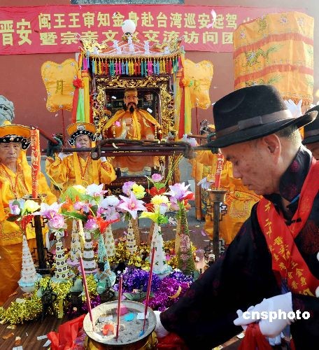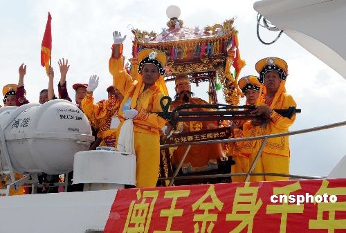 6月19日,闽王王审知金身在福州市闽王金身赴台巡安暨宗亲文化交流访问团一行护送下,登上“闽珠二号”轮,从福州马尾港起程循“两马”航线赴台湾岛内进行为期十天的巡安活动。这是闽王金身首度直航台湾入岛巡安。中新社发 刘可耕 摄