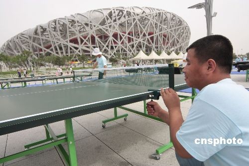 6月19日,北京国家体育场“鸟巢”前景观大道,工人在摆放1000台乒乓球桌,迎接北京市第七届全民健身节开幕。届时,将有乒乓球世界冠军、国际友人、大中小学生等上万人参与,他们将在上千台乒乓球桌上进行乒乓球展示。中新社发 吴芒子 摄