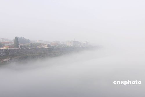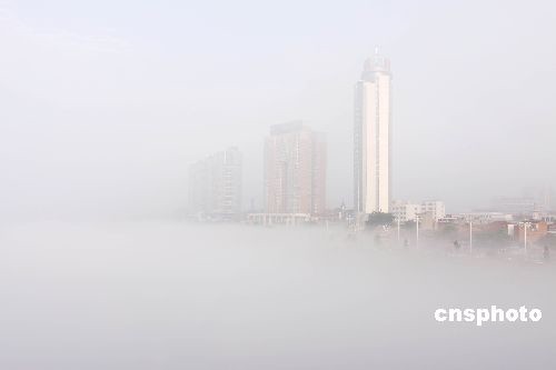 2009年6月22日晨7点左右,湖北襄樊汉江河面烟笼雾绕、云蒸霞蔚,蔚为壮观的平流雾让两岸建筑犹如悬浮空中,犹如海市蜃楼美景。8点左右雾气渐渐消散。据气象专家介绍,这是由于襄樊近期降雨较多,空气湿润,加上温差的关系,造成江面起雾。中新社发 李富华 摄