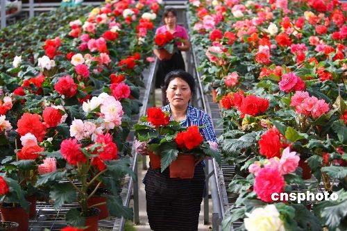 6月22日,在北京草桥杨镇花卉基地一位花卉工人正在手捧朝鲜“金正日花”从海棠花中走过。据草桥基地负责人介绍“金正日花”属于海棠科多年生球根花,是日本花卉专家加茂元照经过多年研究培育出来的。在1988年送给朝鲜领导人金正日,作为领袖46岁生日的礼物,并以金正日命名。民众可以在今年9月26日召开的第七届中国花卉博览会上一睹它的芳容。为了确保“金正日花”能在花博会上如期盛开,杨镇草桥基地专门从朝鲜聘请了3名专业技术人员,他们对“金正日花”的生长温度、适度控制非常严格,给花浇水、施肥都要按照严格的标准执行。目前,“金正日花”长势喜人。中新社发 富田 摄