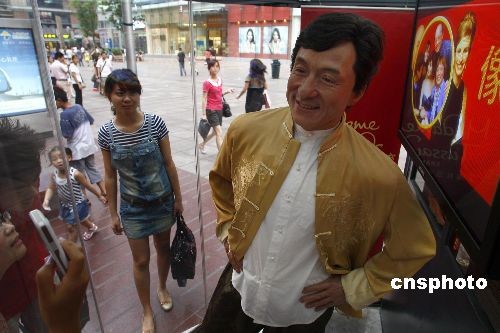 6月22日,一逼真的“成龙”蜡像现身上海南京路步行街街头与过往游客对话,吸引不少“粉丝”与其拍照留念。中新社发 郑雄增 摄