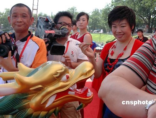 6月28日,北京师范大学艺术与传媒学院副院长于丹身穿漂亮的红色披肩,戴着红色项链出席了在北京昆玉河八一湖畔举办的“中华龙舟大赛”决赛现场,并在决赛前,为现场观众作了“关于中国龙文化”讲演。中新社发 李文明 摄