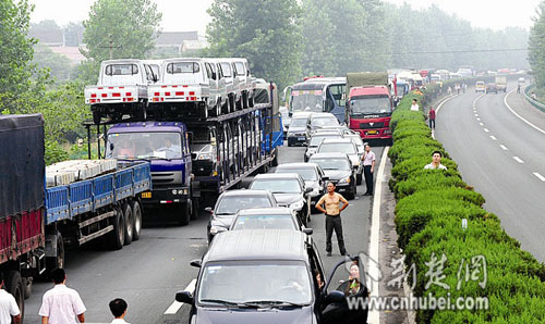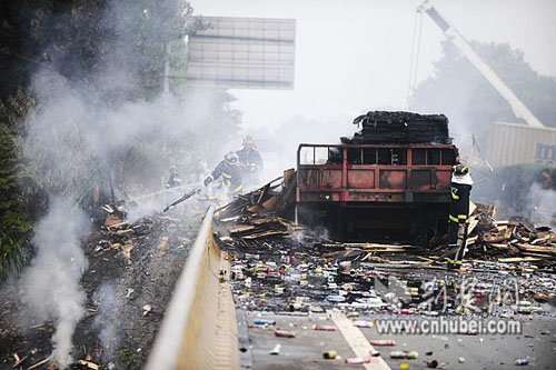 昨(28日)日下午2时许,武黄高速鄂州长岭大桥路段突发车祸:一辆集装箱卡车失控越过隔离带,撞上逆向行驶的一辆挂车,挂车上运载的货物发生爆燃。事故导致武黄高速公路全线中断约5个小时,数千车辆滞留。(萧颢 摄)