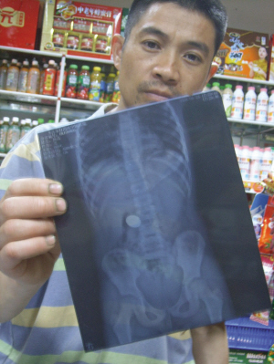 “我们夫妻俩是做生意的,没时间在家带孩子。23号那天晚上,电视里正在表演变魔术的综艺节目,儿子一个人边看电视边拿着一枚硬币玩,我们忙着做饭也没管他。直到第二天早上,他才告诉我头天晚上将硬币吞到肚子里了,我赶紧带他去了医院。”杨先生说:“做完透视,拍完片子,医生诊断说,孩子肚里确实有一枚硬币。医生建议让孩子多吃韭菜,看能不能将硬币排泄出来。现在已5天了,还是没排出来,怎么办?”
