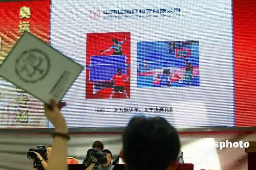 6月30日,北京奥运会专用物资拍卖会迎来“谢幕秀”,北京奥组委处置奥运物资的最后一拍当日举行,乒乓球决赛用祥云比赛台、主席台座椅、茶几等130多件奥运物资届时公开拍卖。 此次拍卖的奥运特殊物品主要包括主席台茶几及座椅、国际贵宾厅专用沙发、鸟巢私人餐台、乒乓球决赛用祥云比赛台等,其中包括30余件奥运会前专为国家领导人及各国元首设计的绝版沙发及座椅,每个版本仅此一件。中新社发 富田 摄