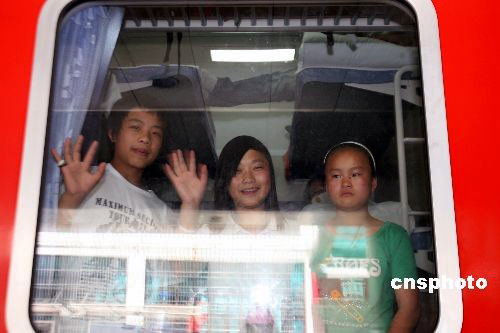 6月30日,最后一批在山西长治过渡复学的636名四川地震灾区师生郑州乘坐专列返乡。去年发生的四川汶川大地震,由于房屋倒塌受损严重,致使灾区无法复课,有1200名师生在山西长治进行为期1年的异地过渡复学。中新社发 王中举 摄