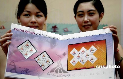6月30日,在广州亚运会倒计时500天之际,由第16届亚运会组委会授权、中国邮政发行的广州亚运会首套纪念邮票《第16届亚洲运动会》在广州举行首发仪式。该套纪念邮票共两枚,图案分别为广州亚运会的会徽和吉祥物,采用五色影写版印刷方式,由中国著名邮票设计家方军设计,画面将岭南文化元素与亚运元素融为一体,具浓郁岭南气息。中新社发 刘卫勇 摄
