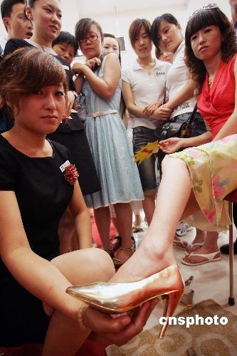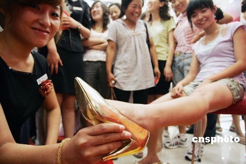 7月5日,山东潍坊市一家商场内,众多女市民在争相试穿“黄金高跟鞋”。据介绍,这款“黄金高跟鞋”是银制镀金鞋,尺码为35码,现场有300多名女市民报名试穿,但最后只有40多人才能穿上。中新社发 张驰 摄
