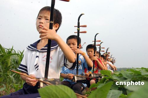2009年7月6日,一曲《在希望的田野上》的乐曲飘荡在河南新蔡栎城乡六里棚村的田野上。当日,六里棚中村小学的留守儿童们在田野上拉练二胡曲,碧绿丰实的田野成为这些孩娃们快乐消夏的乡村音乐“会所”。中新社发 赵学风 摄