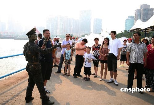 7月初,山东青岛市五四广场上的真人雕塑吸引游客“眼球”。这些古铜色的真人雕塑有的打扮现代、有的古朴,倚靠在广场的栏杆上,不断变换着姿势与表情。由于他们从头到脚被喷上了古铜色油彩,其肤色独特,打扮各异,吸引了大批游客的目光。中新社发 胡卫国 摄