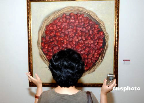 7月10日,山西吕梁“红枣颂”美术展在北京中国美术馆开展。此次展出的油画、国画、版画等作品充满了朴实的乡土气息,展现了枣树所蕴涵的人文精神,获得了观众的好评。中新社发 李学仕 摄