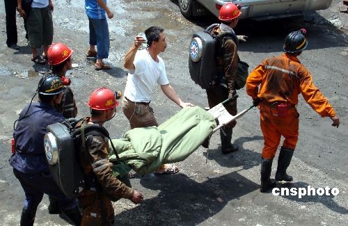 贵州晴隆新桥煤矿“6.17”透水事故在全体抢险救援人员的艰苦努力、日夜奋战下,历经25天、604小时的抢险救援,取得突破性进展,2009年7月12日12时,在矿井上山巷与平巷交叉处成功营救出王圈杰、王矿伟、赵卫星3名被困矿工,他们均为河南汝阳人,营救出井时,意识较清醒,三人创造了604小时的生命奇迹,在场的全体抢险救援人员都为他们顽强的生命所感动。目前,救援指挥部医护人员正在对他们进行身体检查,并采取相应的医疗措施对他们进行医疗救护,据观察,生命体征基本平稳。同时,抢险救援人员正在井下紧急搜救其他被困矿工。中新社发 彭年 摄