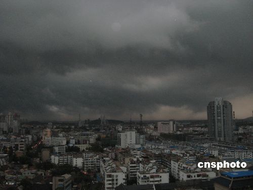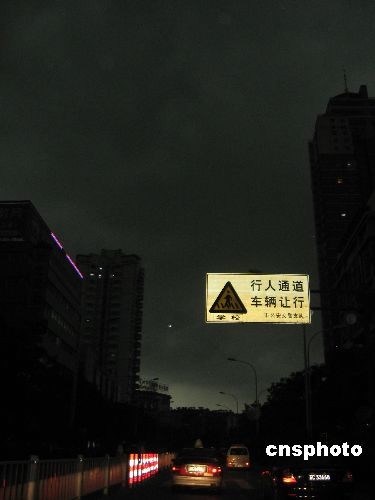 七月十三日下午五时许,徐州市区出现入夏以来第三次乌云盖顶的景象,市区能见度急速降低,大雨接踵而至, 将白日的城市瞬间拉入“黑昼”,汽车开灯“夜”行。中新社发 邵国栋 摄