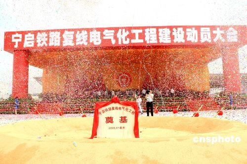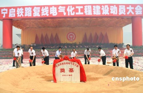 7月14日,宁启铁路复线电气化工程建设动员大会在江苏省泰州市泰州火车站举行。国家铁道部部长刘志军、江苏省委书记梁保华、省长罗志军,上海铁路局局长安路生以及泰州市委书记张雷等出席。宁启线路全长约268.3公里,项目总投资139亿元,工期3年。建成后南京至南通运行时间将从3小时50分缩短至1小时50分。图为铁道部、江苏省有关领导共同为工程奠基。中新社发 崔佳明 摄