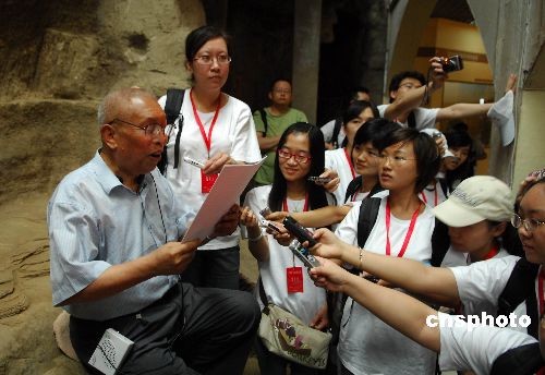 7月16日下午,《延安日报》前总编苏若旺先生(左)向参观延安新闻纪念馆的“百名青年编辑记者延安行”成员传授经验,希望年轻一辈能贴近群众、客观公正地进行新闻报道。中新社发 侯宇 摄