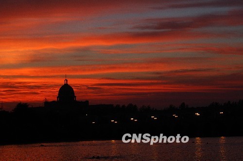 2009年7月20日傍晚,南京出现火烧云景观,吸引纳凉市民驻足观赏。入伏以来,南京持续高温,天气晴好。中新社发 孙忠南 摄