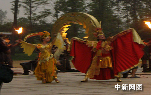 7月22日,成都金沙遗址演绎“古蜀人”祭日大典。9时11分,食既开始,四周天色逐渐暗了下来,金沙遗址内民众顿时静了下来,9时12分,震撼人心的“古蜀人”祭日大典开始。随着古蜀人”在火光中起舞,吼叫、顶礼膜拜,日全食进入到生光阶段,天气逐渐亮起来。王萌 摄