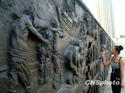 2009年7月26日,一名游人在欣赏铸铜浮雕《姑苏物语》。位于苏州金鸡湖畔的苏州市最大的铜铸浮雕《姑苏物语》每天吸引了大批游人前来观赏。该组铜铸浮雕长127米,雕有“白沙枇杷”、“桃坞年画”、“年糕飘香”等31个立体场景,全方位展现了姑苏的风土人情。 中新社发 王建康 摄