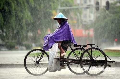 2009年7月27日,一场大雨降临海南琼海。当日,海南气象台继续发布高温危险天气预报:部分地区再现35-37度的高温天气。闷热难耐时刻,琼海市一场大雨不期而至,煎熬中的人们得到解脱。中新社发 蒙钟德 摄