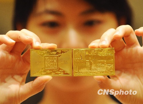 8月10日,中钞国鼎投资有限公司和中国集邮总公司发行的纪念中华人民共和国成立六十周年《开国大典》邮票金砖在京上市。该邮票采用纯金铸造,每枚重60克,全国限量发行6000枚,并配有收藏证书和唯一编号。中新社发 远舟 摄