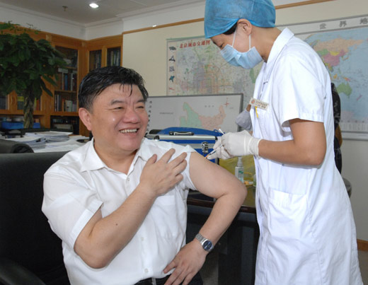 作为国内受试甲流疫苗第一人,卫生部长陈竺8月11日接种了第二针甲流疫苗,标志着甲流疫苗临床试验受试者开始接种第二针。