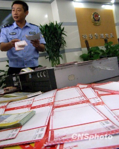 北京警方历时十五天,行程近万里,成功端掉北京首个跨省特大伪造大型活动门票的犯罪组织,共起获假门票三千四百余张,拘留犯罪嫌疑人八名。据北京警方在十三日举行的新闻发布会上介绍,该犯罪团伙从假门票设计、制作及销售的犯罪链条都比较完整,各嫌疑人之间虽不谋面,但分工明确、组织庞大。今年,该团伙先后伪造倒卖了中超联赛、五月天演唱会、东方神起演唱会、英超亚洲杯足球赛等大型活动的假门票。中新社发 谭旭燕 摄