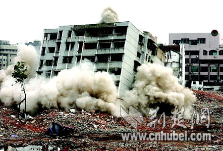 昨日(28日)下午2时30分,随着“轰隆隆”一阵爆破声响过,位于汉口花楼街熊家中巷53号的一栋8层居民楼,倒在滚滚升腾而起的烟尘之中。据悉,该地块为香港和记黄埔项目用地,总拆迁面积约为2万平方米。(谭新杰 朱安璋 罗启军)