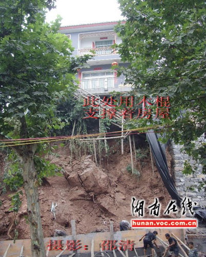图中一栋三层楼的水泥楼房立在坍塌山体的中间位置, 四处均是裸露在外的黄土,为了防止楼房塌陷,房主紧急支了几十根木桩,撑在露在外部的楼房基座处,并用水泥在山底砌地基加固。远远望去,楼房成了颇具湘西地方特色的“吊脚楼”。