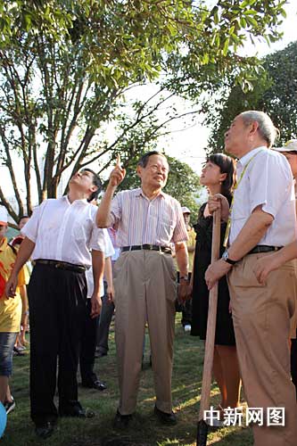 9月7日傍晚,来重庆参加中国科协第11届年会的杨振宁夫妇和上百位中国科学院和中国工程院院士在重庆渝北龙头寺公园植下桂花、广玉兰、香樟树等,为重庆种植出一片“院士林”。图为杨振宁夫妇和其他院士与重庆的小学生们共同种下一株桂花树。记者 郭虹 摄