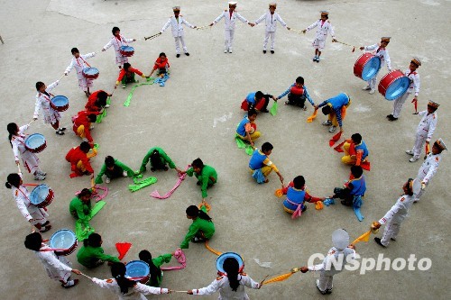 9月8日,河南新蔡县关津乡和谐双语学校留守儿童们正在排练欢庆新中国成立60周年文娱节目。“与中国同乐”、“盛世年华”、“欢庆腰鼓”等一个个精彩的节目,表达出孩子们对新中国60华诞的美好祝福。届时,留守儿童将以这些节目向国庆献礼。中新社发 赵学风 摄