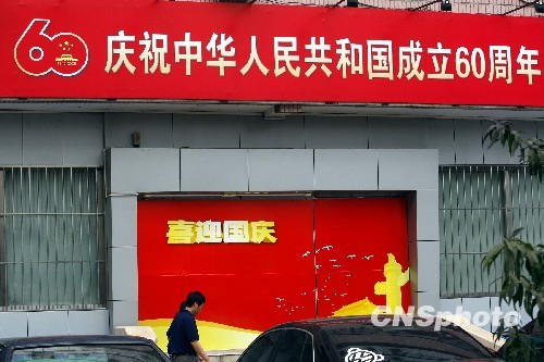 9月8日,市民从北京街头一国庆宣传标语前经过。随着国庆临近,北京街头节日气氛渐浓。中新社发 郑雄增 摄
