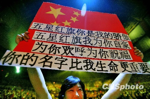 当地时间9月20日,以“感动世界,中国有我”为主题的全球华人共庆新中国成立六十周年《同一首歌》——走进美国旧金山大型演唱会圆满落幕。 一位宫姓女士自制了一面五星红旗,用独特的方式祝福新中国六十华诞。中新社发 陈钢 摄