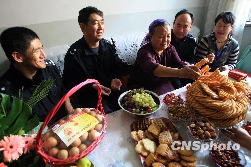 9月21日是穆斯林传统节日开斋节,新疆乌鲁木齐市76岁维吾尔族大妈提拉汉准备了一桌丰盛的民族特色美食,邀请援疆特警到家中共度节日。中新社发 刘新 摄