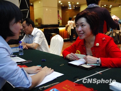 9月28日上午,来自英国的华侨华人代表李女士(右)在北京西苑饭店签到登记,准备参加国庆六十周年庆典。中新社发 侯宇 摄