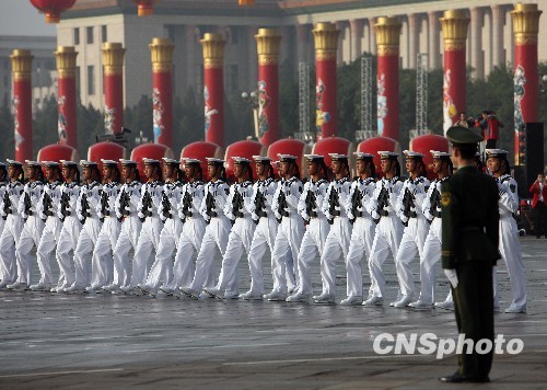2009年10月1日,中华人民共和国成立60周年庆祝大会开始前,参加阅兵的方队提前适应场地。中新社发 杜洋 摄
