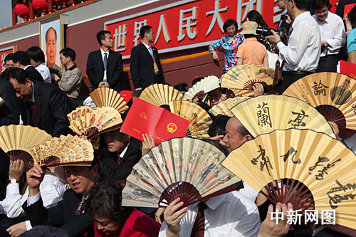 十月一日上午九点半,刚刚下了几点太阳雨后,灿烂的阳光很快穿透云层,洒满天安门广场。观礼台上,嘉宾们热得纷纷拿出折扇遮阳。有一位嘉宾更手举现场散发的国庆阅兵介绍文本遮挡阳光。张朔 摄