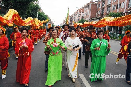 10月12日,侨乡福建泉州各个区县里有名的南音队伍齐集古城泉州,唱出自家的看家曲目,进行快乐踩街,庆祝南音入选“人类非物质文化遗产代表作品名录”。南音是中国现存最古老的乐种之一,千百年来“口传心授”,广泛流传于闽南语系地区,被誉为“中国音乐史上的活化石”。中新社发 傅丹丹 摄